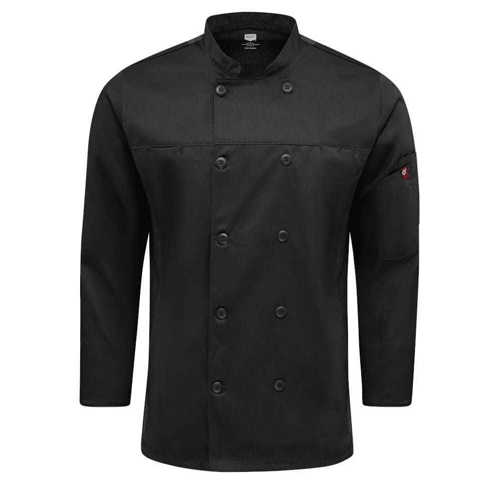 A kitchen staple. Our classic fit Deluxe Airflow Chef Coat for men fits all shapes and sizes. The lightweight fabric wicks moisture and releases tough kitchen stains so you’ll look clean and professional until shift’s end. Strategically placed, perforated stretch panels improve airflow for enhanced cooling while providing an elevated look. A double-breasted closure with matching buttons and two inset chest pockets offer sophisticated styling, while turn-back long sleeves offer versatility. Topped off with a handy dual utensil sleeve pockets for go-to kitchen gadgets and a lined collar for added comfort. Available in three colors.