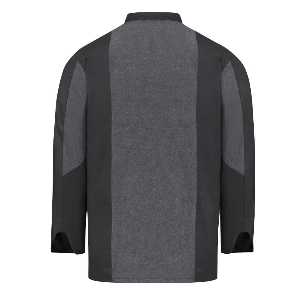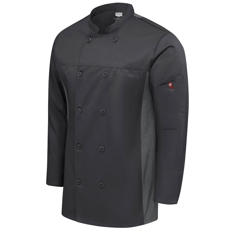 A kitchen staple. Our classic fit Deluxe Airflow Chef Coat for men fits all shapes and sizes. The lightweight fabric wicks moisture and releases tough kitchen stains so you’ll look clean and professional until shift’s end. Strategically placed, perforated stretch panels improve airflow for enhanced cooling while providing an elevated look. A double-breasted closure with matching buttons and two inset chest pockets offer sophisticated styling, while turn-back long sleeves offer versatility. Topped off with a handy dual utensil sleeve pockets for go-to kitchen gadgets and a lined collar for added comfort. Available in three colors.