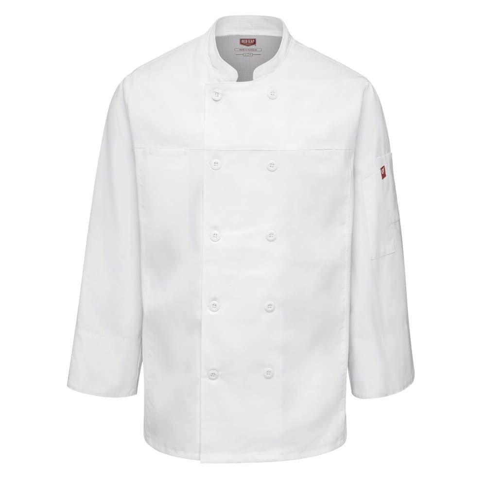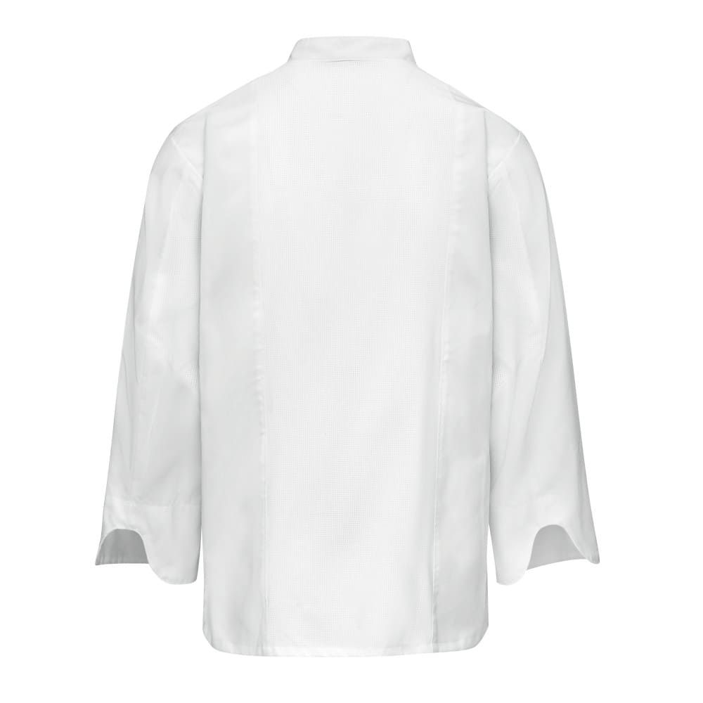 A kitchen staple. Our classic fit Deluxe Airflow Chef Coat for men fits all shapes and sizes. The lightweight fabric wicks moisture and releases tough kitchen stains so you’ll look clean and professional until shift’s end. Strategically placed, perforated stretch panels improve airflow for enhanced cooling while providing an elevated look. A double-breasted closure with matching buttons and two inset chest pockets offer sophisticated styling, while turn-back long sleeves offer versatility. Topped off with a handy dual utensil sleeve pockets for go-to kitchen gadgets and a lined collar for added comfort. Available in three colors.