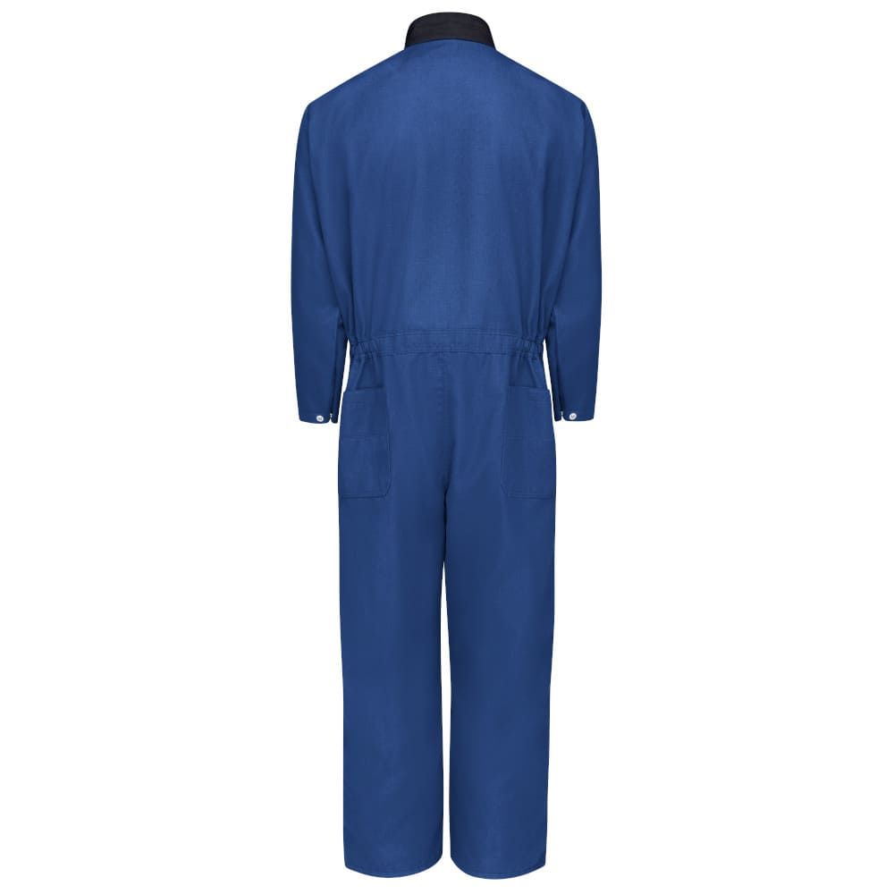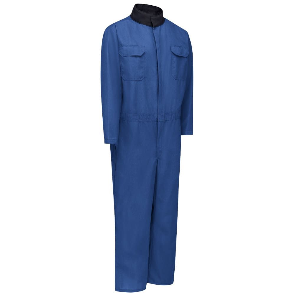 Black stand up collar with concealed snap at neck. Action back. Two-way, concealed, Nomex® tape, brass, break-away zipper. Elastic waist. Snapped wrist closure. Splash resistant side pass- through with snap closure for easy inner pocket access. Two front chest pockets with added pencil stall on left pocket and two rear patch pockets for storage.