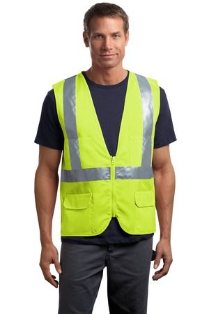 ANSI/ISEA Class 2 certified 100% polyester oxford for smooth printing Dyed-to-match binding and Vislon zipper Mesh inset at back for breathability 2-in. wide reflective taping on front and back Chest and lower pockets for pen and tools This garment must be fully zipped to be in compliance with ANSI/ISEA standards