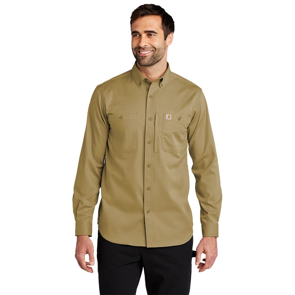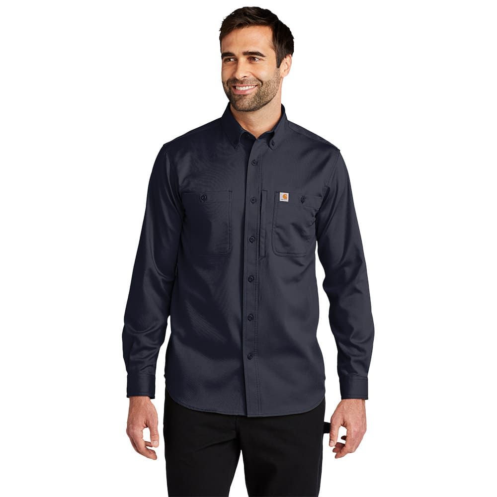 Clean and simple, this button-down work shirt can do it all. A triple-stitched, wrinkle-free design maintains a professional appearance, day in and day out. 5-ounce, 58/39/3 cotton/poly/spandex Rugged Flex® durable stretch technology for ease of movement Stain Breaker® technology releases stains in the wash Button-down collar Two chest pockets with button closures Left chest map pocket with zipper closure Carhartt label sewn on left chest pocket Carhartt-strong, triple-stitched main seams Two-button adjustable cuffs Relaxed fit
