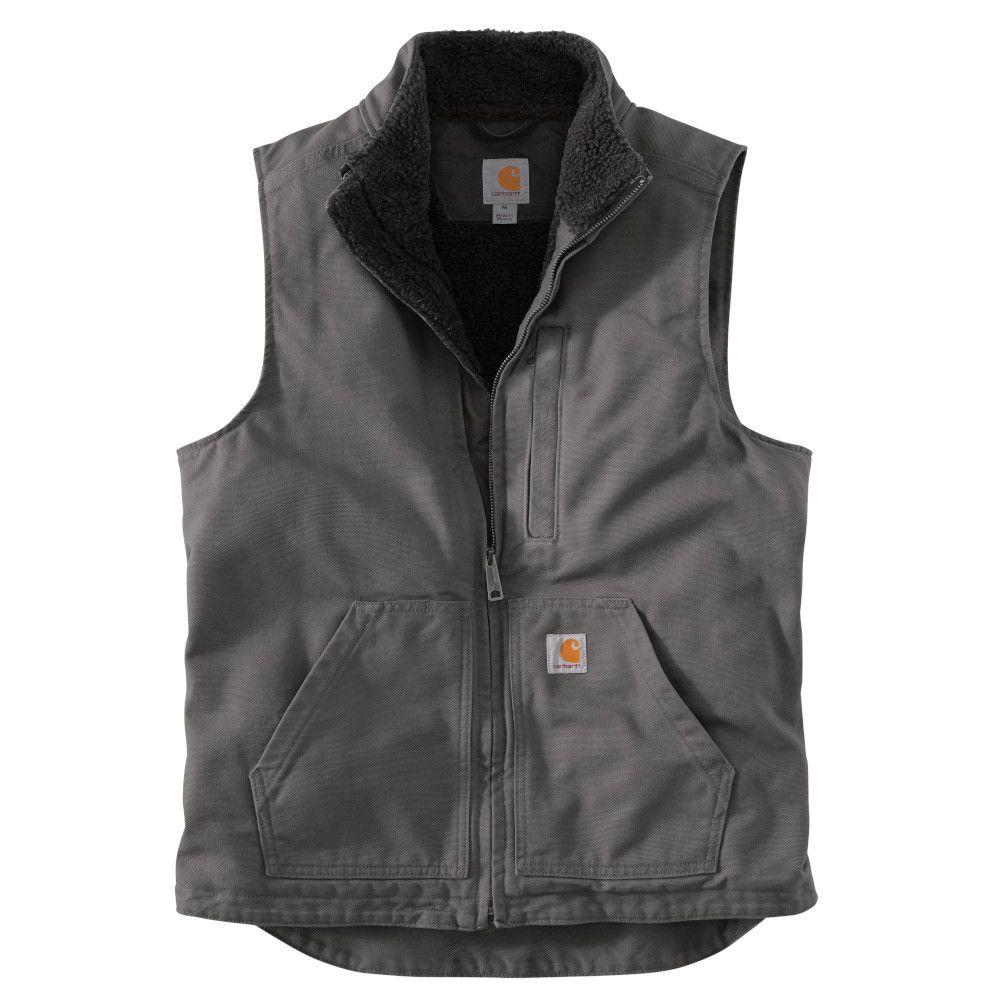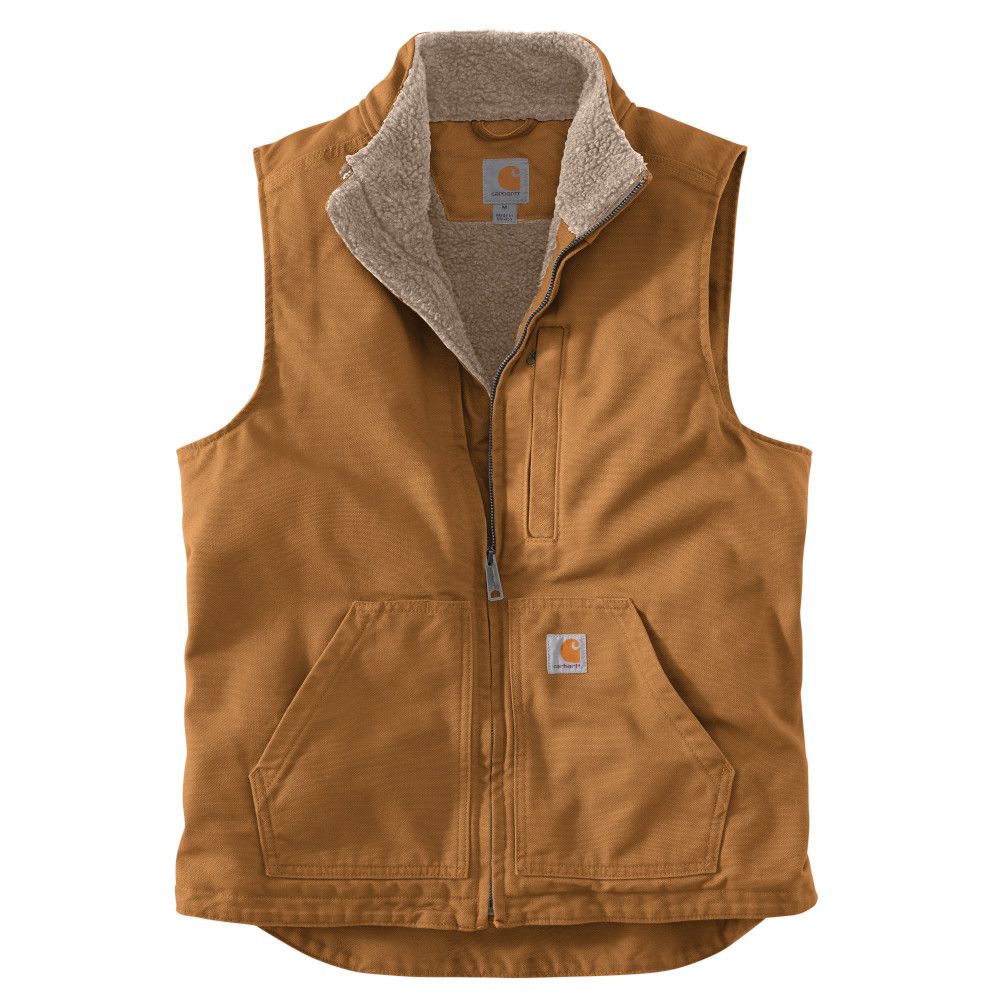 When you need that extra layer out in the field, this warm, sherpa-lined vest is the one to keep handy. 12-ounce, 100% cotton washed duck Sherpa-lined body for warmth Left chest pocket with zipper closure Two interior pockets Two large, sherpa-lined hand warming front pockets Drop tail hem for added coverage Carhartt-strong, triple-stitched main seams for added durability Carhartt label sewn on left pocket