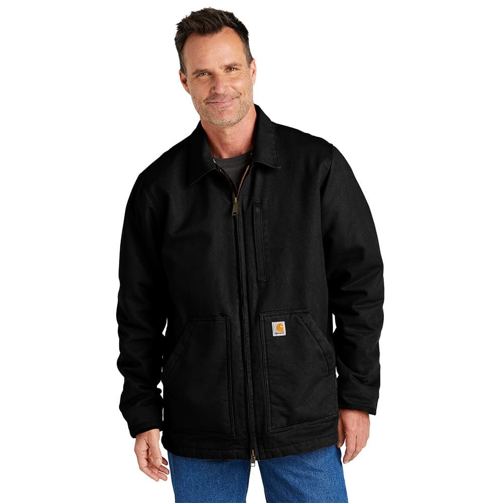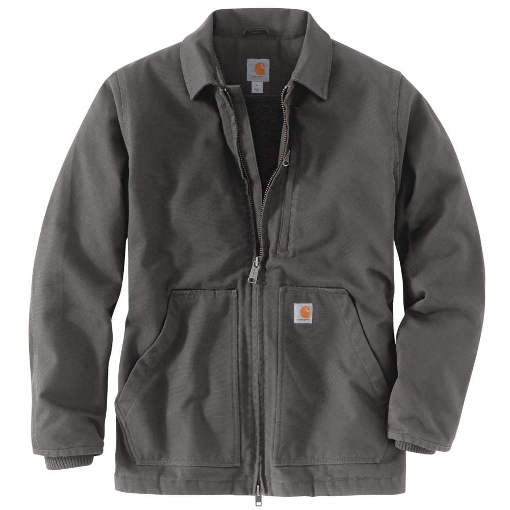 Classic Carhartt style meets Carhartt durability in this coat which features our signature cotton duck fabric for a tough exterior and a soft sherpa lining for warmth and comfort. 12-ounce, 100% cotton washed duck Sherpa-lined body for warmth Quilted-nylon lined sleeves for easy on-and-off Under-collar snaps for optional hood (sold separately) Pleated bi-swing back for additional range of motion Left chest pocket with zipper closure Two interior pockets Two large, sherpa-lined hand warming front pockets Interior rib knit storm cuffs help keep out the cold Carhartt-strong, triple-stitched main seams for added durability Carhartt label sewn on left pocket