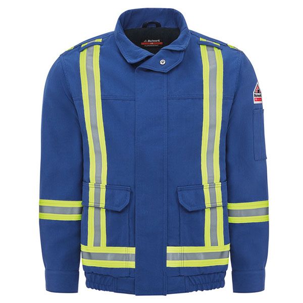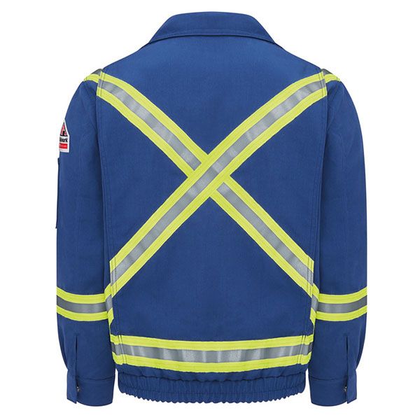 This lightweight CAT 2 FR/AR bomber-style jacket is lined and features 2" reflective trim to keep you warm and safe in the field. Water-repellent fabric helps you stay dry, and innovative features like the elasticized waistband and deep-pleated action back increase comfort and mobility.