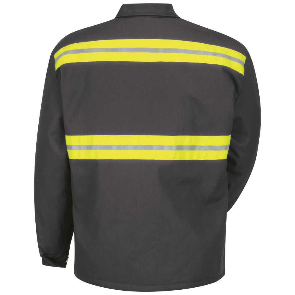 Permanently lined with black quilted lining Two-piece, topstitched collar with sewn-in stays Two lower, inset, on-seam pockets Hip-length 2 1/2" Yellow/Silver/Yellow enhanced visibility trim Trim : down both sleeves, across chest above pockets and two stripes across back This product does not comply with ANSI 107-2004 or ANSI 107-2010