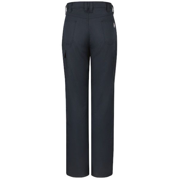 One-piece waistband with concealed button closure > Two scoop front pockets, concealed pocket on right pocket bag > Two hip patch pockets > Full crotch gusset > Utility loop extension on front belt loop > Cargo pocket with snap closures on left leg > Double utility pocket on right leg > Double articulated knees.