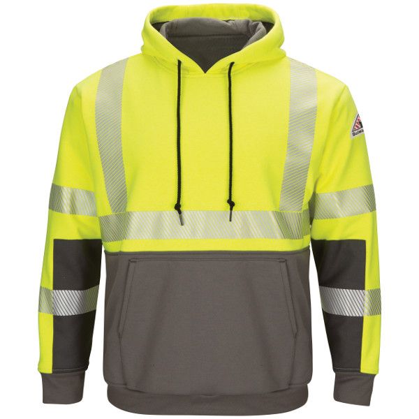 This color block hooded sweatshirt features updated styling to keep you warm when the days turn chilly. This FR hi-visibility pullover is made for warmth, comfort, and work. It features iQ Series® Endurance rip stop twill reinforcement on interiors of sleeves to increase durability. The sweatshirt is waffle lined for extra warmth, has a large hand pocket and a 3-piece hood with drawstring closure. This will quickly become your go-to sweatshirt for warmth and protection.