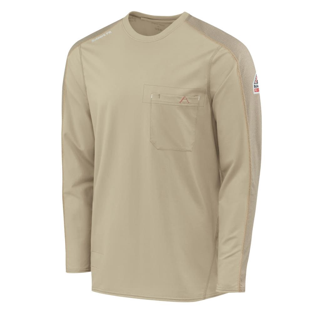 Bulwark FR Men's Flex Knit tee gives you the stretch of your favorite T-shirt while keeping you cool and dry. The lightweight fabric flexes for added comfort and range of movement, curved flatlock seams for optimal fit, unique front pocket design with pencil stall. CAT 2/2112 left sleeve label leaves no question you’re protected on the job site.