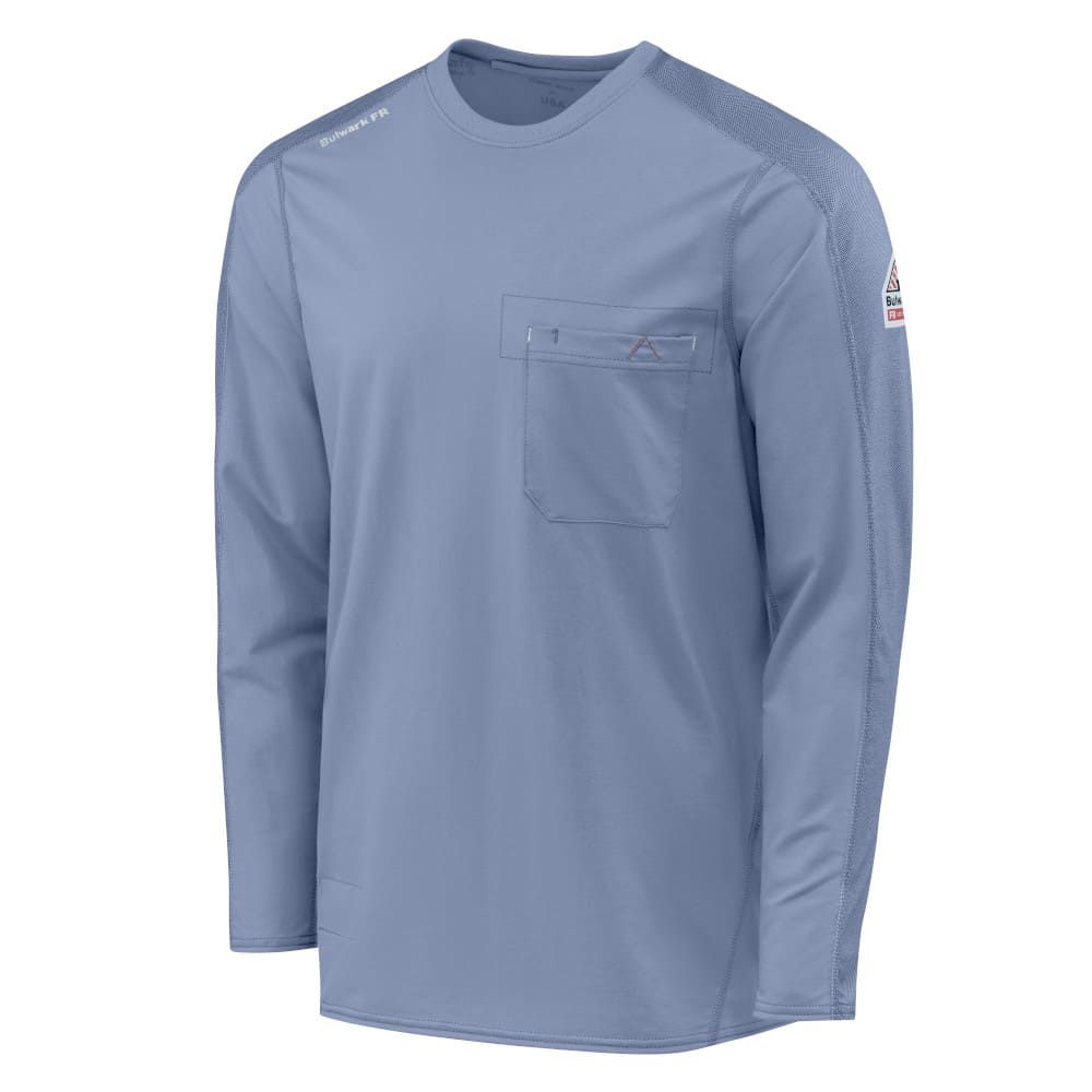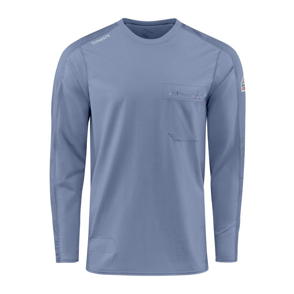 Bulwark FR Men's Flex Knit tee gives you the stretch of your favorite T-shirt while keeping you cool and dry. The lightweight fabric flexes for added comfort and range of movement, curved flatlock seams for optimal fit, unique front pocket design with pencil stall. CAT 2/2112 left sleeve label leaves no question you’re protected on the job site.
